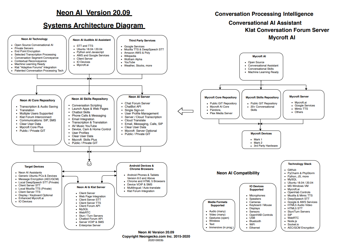Neon integrates voice, text, video, STT, TTS, Conversation Processing Intelligence, AI skills processing, and the latest enabling technologies: real-time Internet communications for audio and video, real-time speech processing, real-time translation, and real-time interactive conversational inquiries of content on the web and in proprietary databases. Neon software source code is available on Git (limited license).