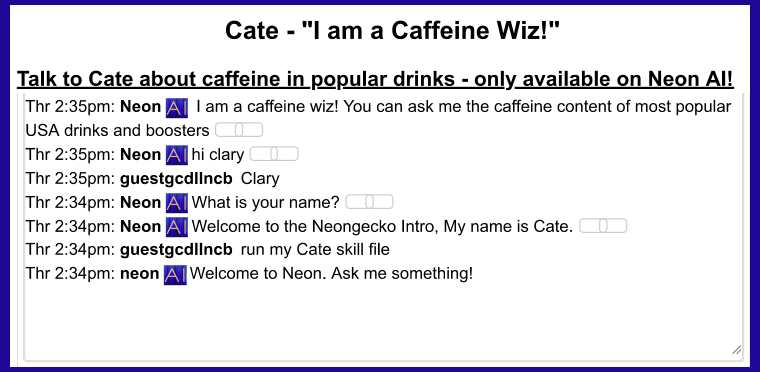 Basic page | Cate - "I am a Caffeine Wiz!" | Wed, 07/13/2022 - 00:10 | 83 | Cate - "I am a Caffeine Wiz!"Talk to Cate about caffeine in popular drinks - only available on Neon AI!